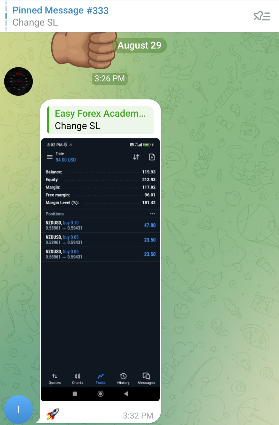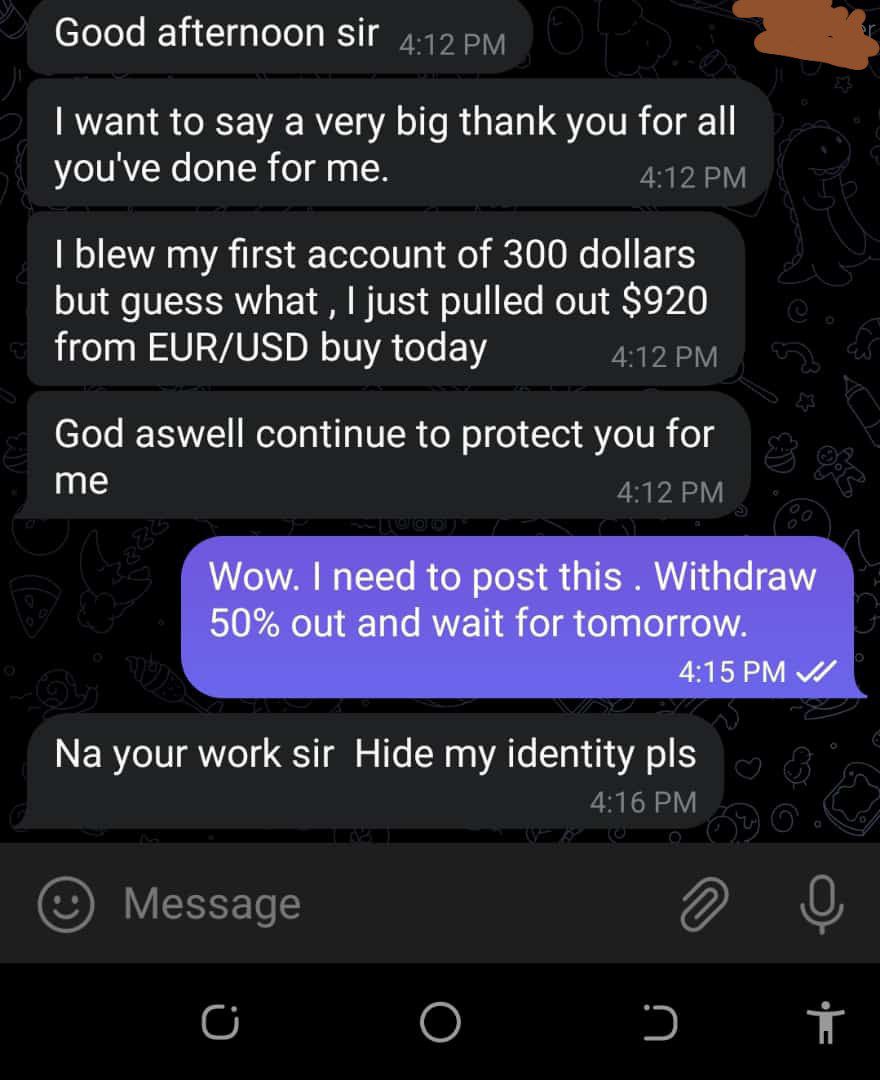 Easy Forex Academy does NOT offer any Investment advice or services whatsoever. All the forex signals that we send are trades that we have taken on our behalf and simply share them via telegram for educational purpose only. We do not guarantee that you will make profits with our signals and we 100% encourage you to do your own research before placing any trades. By signing up to our Forex signals, you acknowledge that we are not providing any kind of financial advice and that you are making your own decision to copy the signals we sent out on your own.